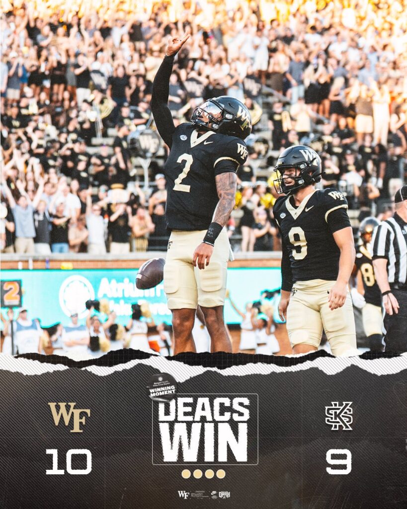 Friday night at Allegacy Stadium in front a large crowd, the Jake Dickert era started off with a bang. as Wake Forest (1-0) took the opening drive of the 2025 season opener for the quick touchdown. The drive lasted 14 plays and 75 yards and lasted 7:02. Newly named starting QB Robbie Ashford started the game on fire going 5-5 for 43 yards passing and added another 13 yards rushing. Ashford capped off the opening drive with a flip into the endzone as he gave the Deacons the early 7-0 lead.