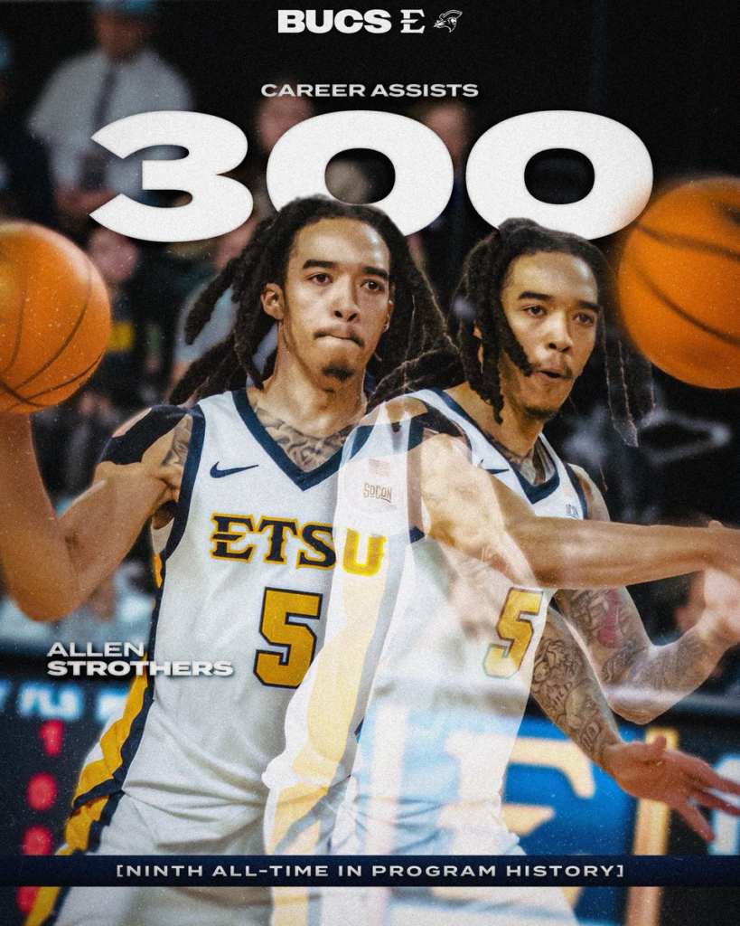 Additionally, a highlight to definitely make is Allen Strothers. The Senior Guard hit a career 300 assists this evening in Greensboro. This milestone makes him the 9th player in ETSU history to have 300 assists.