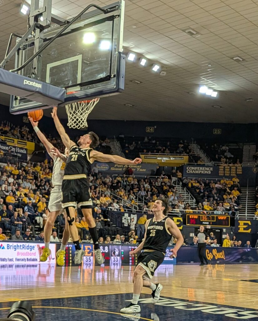 Starting out scoreless and down 8. The Bucs needed some energy, and that’s what they got with a 3 from Maki Johnson, and a score in the paint from Strothers. This energy remained consistent with both Wofford and ETSU who went back and forth fighting for the lead. What was successful for The Bucs in the first half were rebounds (specifically defensive rebounds), blocks, and steals. For instance, in the final 40 seconds of the first half Strother stole the ball, passed it off to Maki Johnson to make a layup pushing The Bucs to a 37-33 lead.